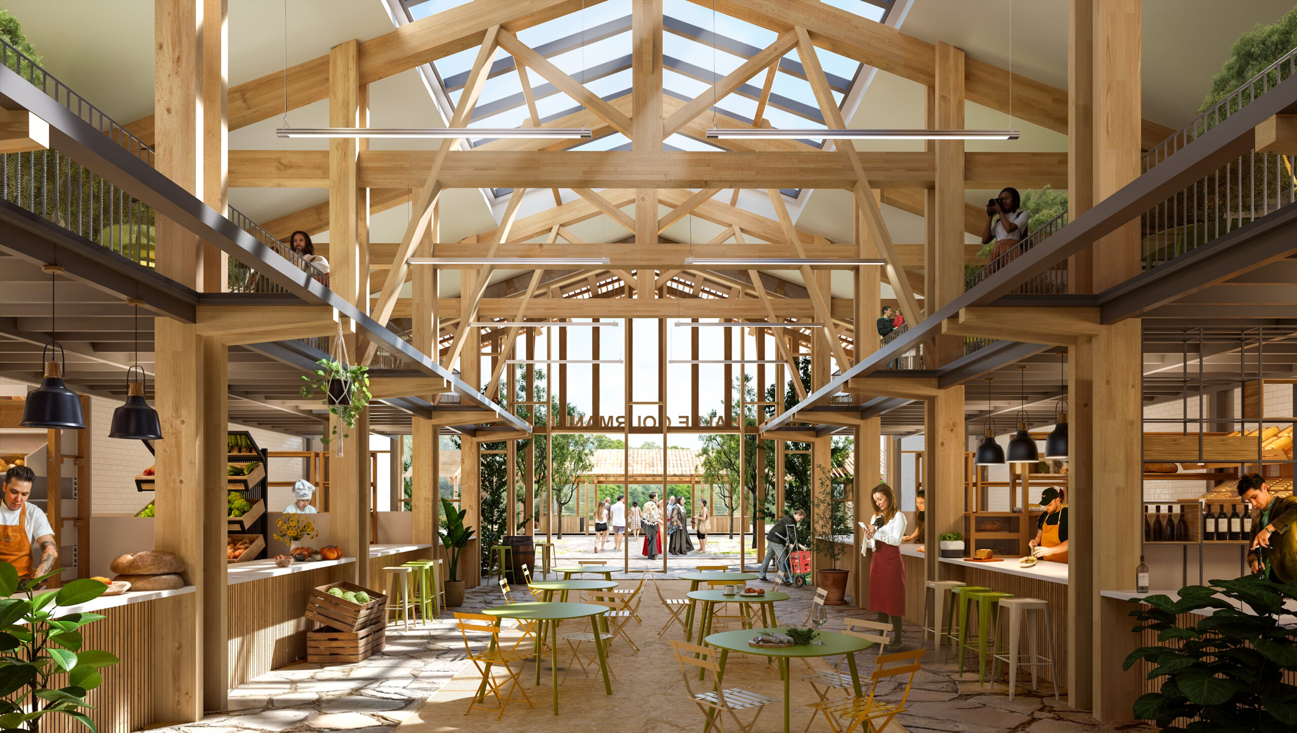 Le projet réunit une école artisanale de la boulangerie — espaces de transmission, fournil ouvert, dégustation — et une halle dédiée aux productions locales. Un même dispositif, deux usages : apprendre et partager.