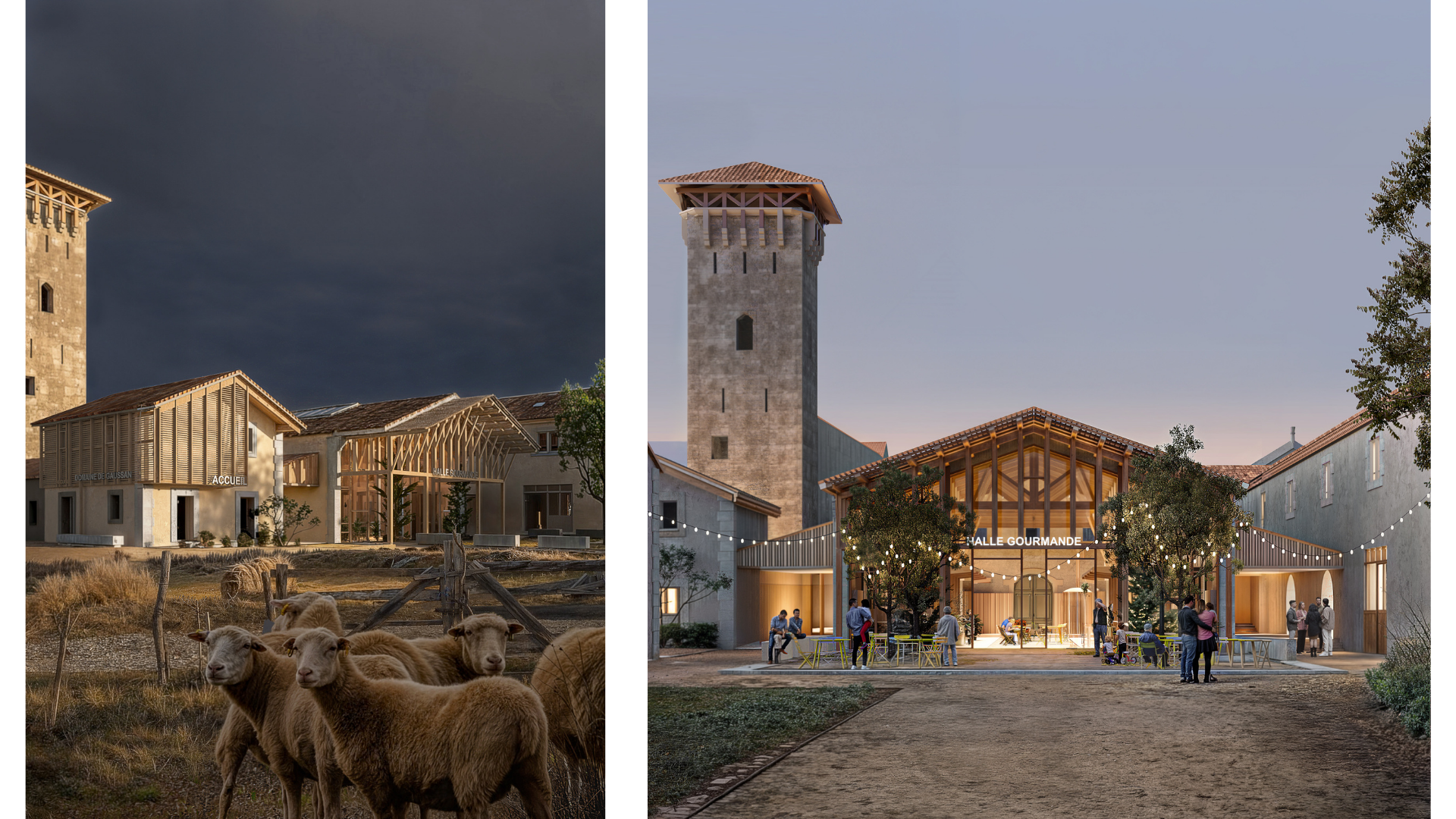 Une architecture de fragments — portée par la pierre, adoucie par le bois. Au cœur du domaine, entre vignes et pins, de fines structures prolongent les ailes historiques et dessinent un espace discret à travers le paysage.