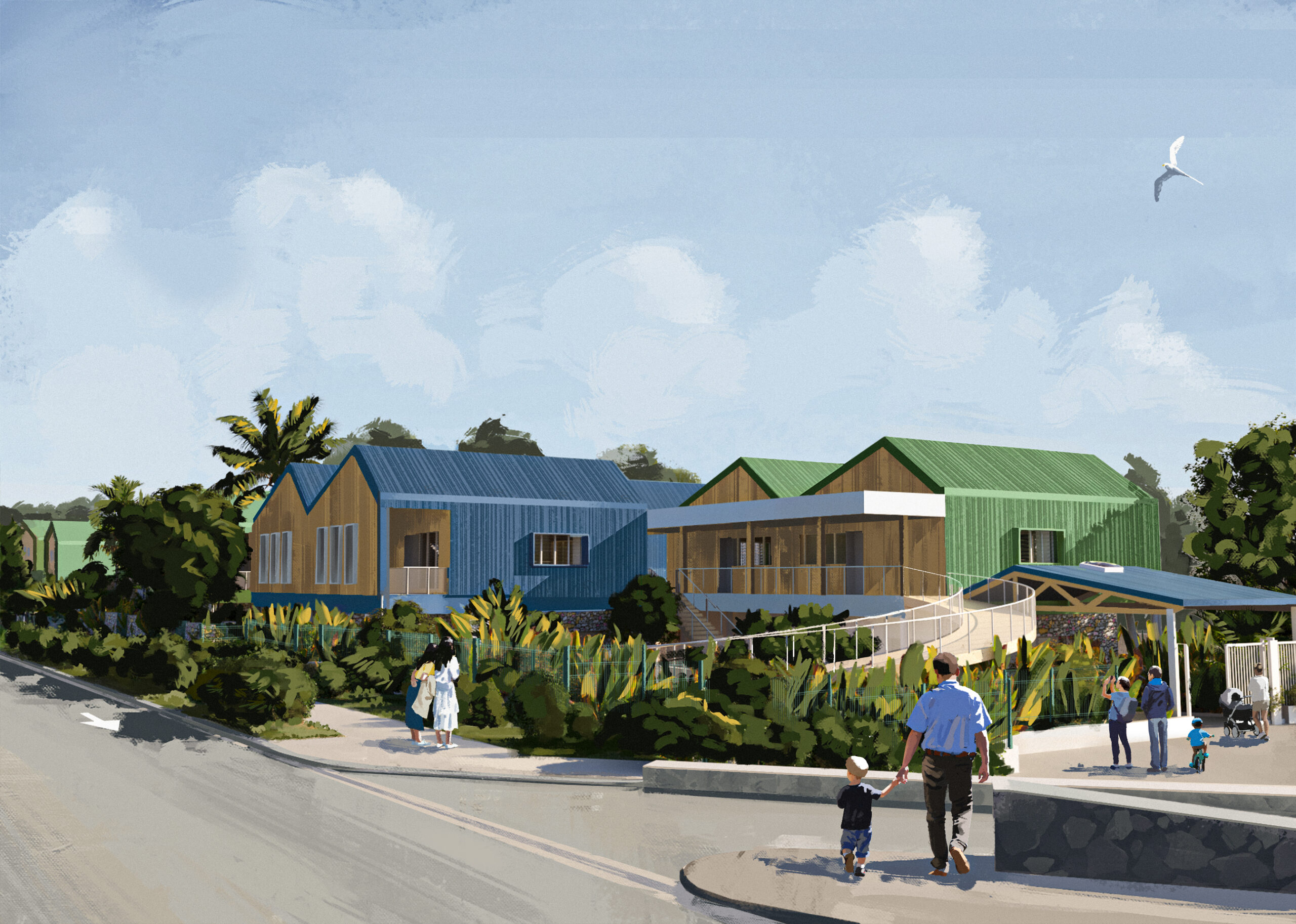 Une école maternelle nichée dans le tissu urbain dense de Saint-Denis, à La Réunion. L’architecture, douce et enveloppante, compose un espace pensé pour l’échelle de l’enfance : ouverte et fluide, protégée par un cocon végétal.