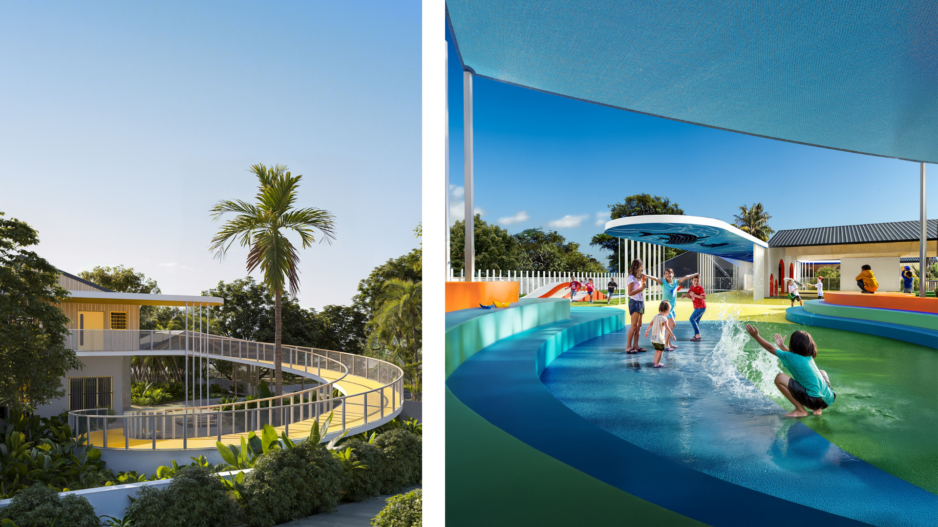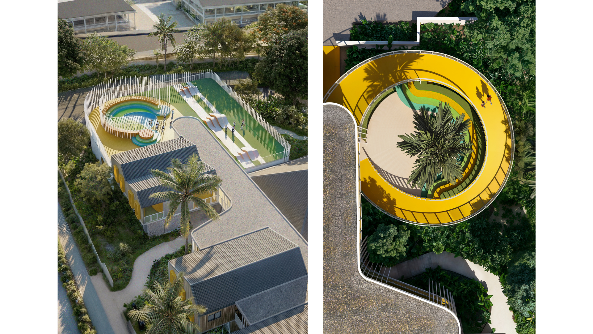 Le travail d’image ne cherche pas à documenter l’objet architectural, mais à en révéler une ambiance — une sensation subtile, faite de lignes courbes, de lumières diffuses et de couleurs vives stimulantes. Les images privilégient l’évocation à la description, laissant place à l’imaginaire, à l’interprétation, à cette part silencieuse de nous qui se souvient des lieux qui nous ont vu grandir.