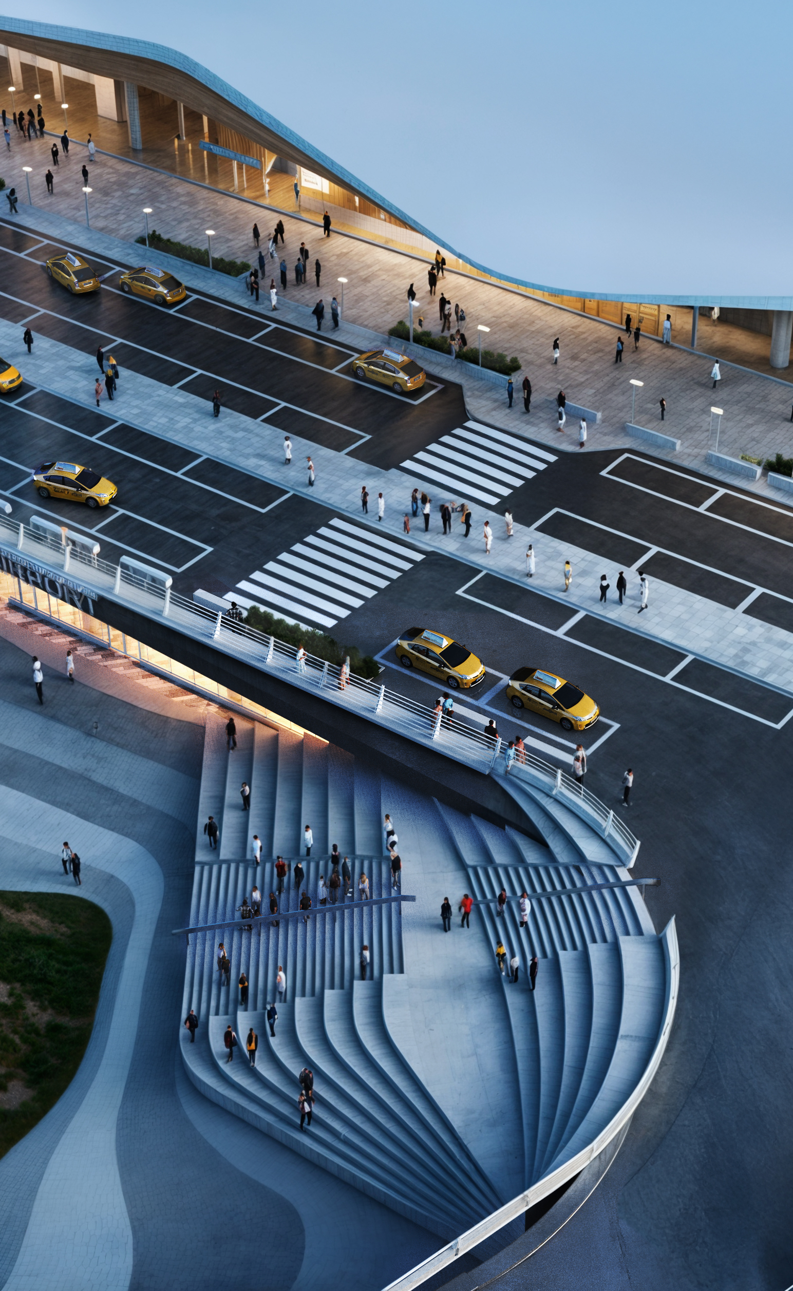 L’architecture se déploie comme un terminal situé à la lisière de deux mondes — une interface entre la ville et le ciel, entre l’ancrage et le vol. Un vaste espace de transition, léger dans ses lignes comme dans son intention. Le projet organise les flux sans les figer, les cadre sans les contraindre. Les volumes émergent d’une base stable, puis s’ouvrent et s’étirent vers le haut, comme attirés par le ciel.